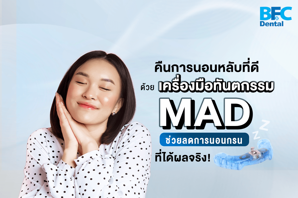 เครื่องมือทันตกรรม MAD (Mandibular Advancement Device) คืออุปกรณ์ครอบฟันชนิดพิเศษที่ทันตแพทย์ออกแบบมาเพื่อสวมใส่ขณะนอนหลับ มีลักษณะคล้ายรีเทนเนอร์หรือเฝือกฟัน ออกแบบให้รับกับฟันบน-ฟันล่างของแต่ละบุคคลโดยเฉพาะ จึงสวมใส่ได้สบายขณะนอน ทำหน้าที่เลื่อนขากรรไกรล่างให้ยื่นไปข้างหน้าเล็กน้อยอย่างเหมาะสม ส่งผลให้ช่องทางเดินหายใจบริเวณหลังโคนลิ้นเปิดโล่ง อากาศไหลผ่านสะดวกและไม่เกิดการสั่นของเนื้อเยื่อ นั่นหมายถึงเสียงกรนที่ลดลงและการนอนหลับที่ลึกขึ้น อีกทั้งยังช่วยลดการอุดกั้นทางเดินหายใจในผู้ที่มีภาวะหยุดหายใจขณะหลับระดับเล็กน้อยถึงปานกลาง