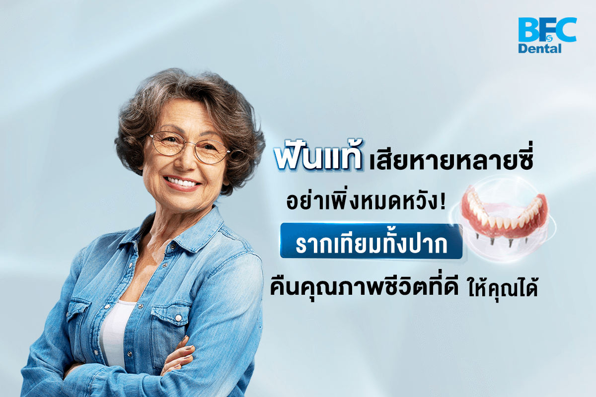 การสูญเสียฟันจำนวนมากไม่ใช่จุดจบของรอยยิ้มอีกต่อไป ด้วยรากเทียมทั้งปาก จะช่วยฟื้นฟูฟันให้กลับมาใช้งานได้ใกล้เคียงฟันธรรมชาติ พร้อมเสริมความมั่นใจให้คนไข้กลับมาใช้ชีวิตได้อย่างมีคุณภาพอีกครั้ง หากคุณหรือคนใกล้ตัวกำลังเผชิญปัญหาฟันติดเชื้อหลายซี่ ฟันโยก หรือสูญเสียฟันแท้ไปแล้วหลายซี่ อย่ารอช้า ปรึกษาทันตแพทย์ ที่ BFC Dental เพื่อวางแผนการรักษาที่เหมาะสม มาเปลี่ยนชีวิตใหม่ด้วยรอยยิ้มที่มั่นใจยิ่งกว่าเดิมด้วยกันเถอะ